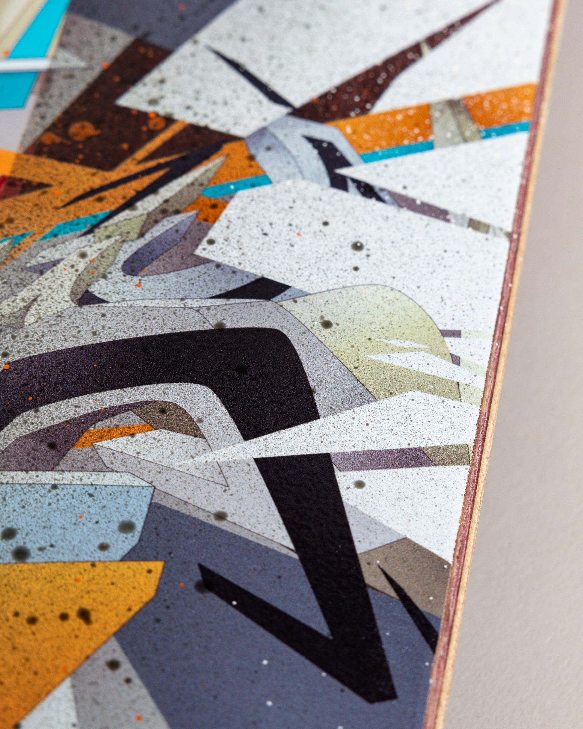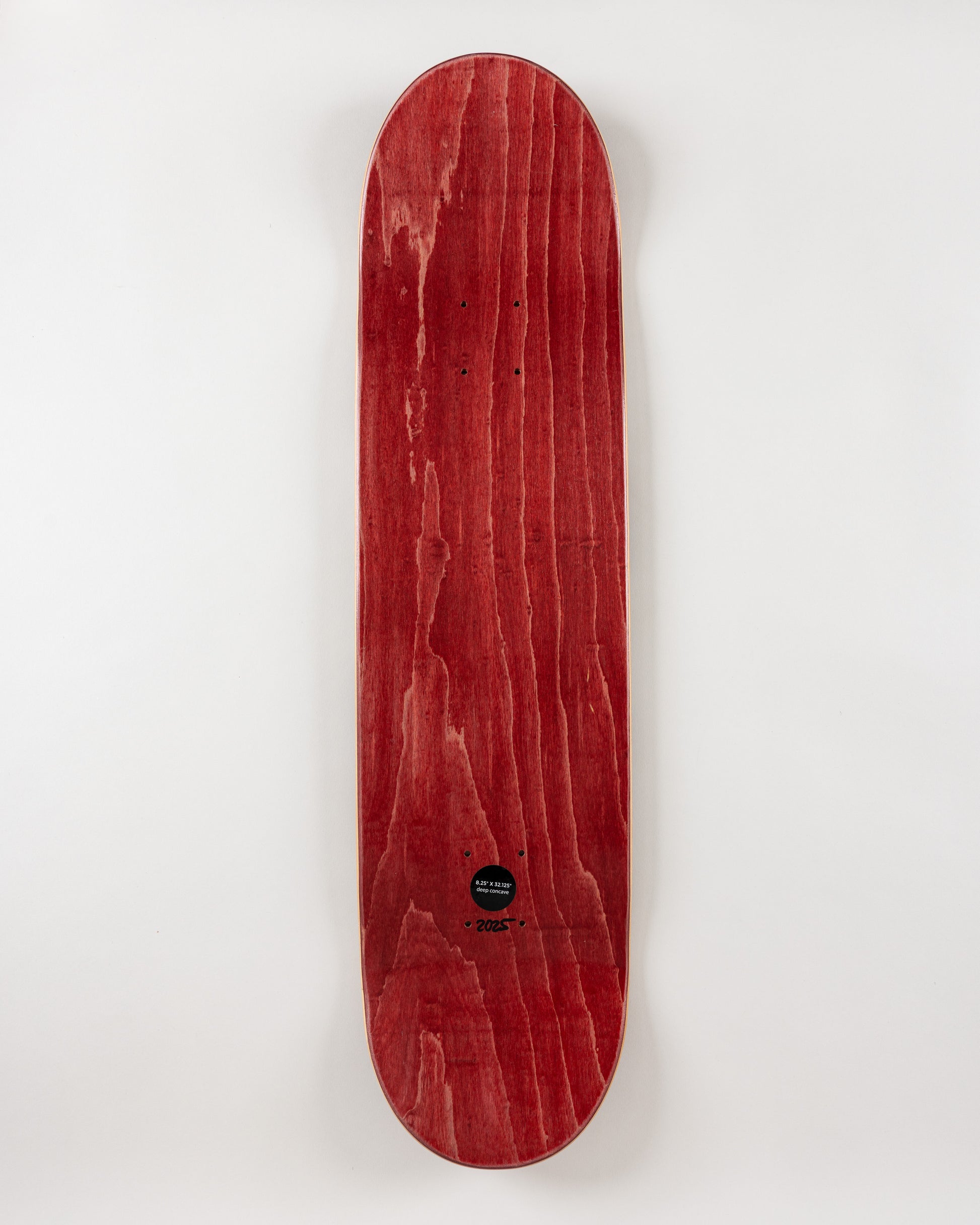 Στο skateboard, αυτή η ιδέα βρίσκει μια εξαιρετική μετάφραση: το γραφικό καλύπτει το deck μόνο μερικώς, αφήνοντας ορατό το φυσικό νεράκι του ξύλου – το αντίστοιχο της τσιμεντένιας επιφάνειας στον τοίχο. Έτσι δημιουργείται ένας συναρπαστικός διάλογος ανάμεσα στο υλικό και τον σχεδιασμό, ανάμεσα στη μνημειώδη τοιχογραφία και το απτό καλλιτεχνικό αντικείμενο.