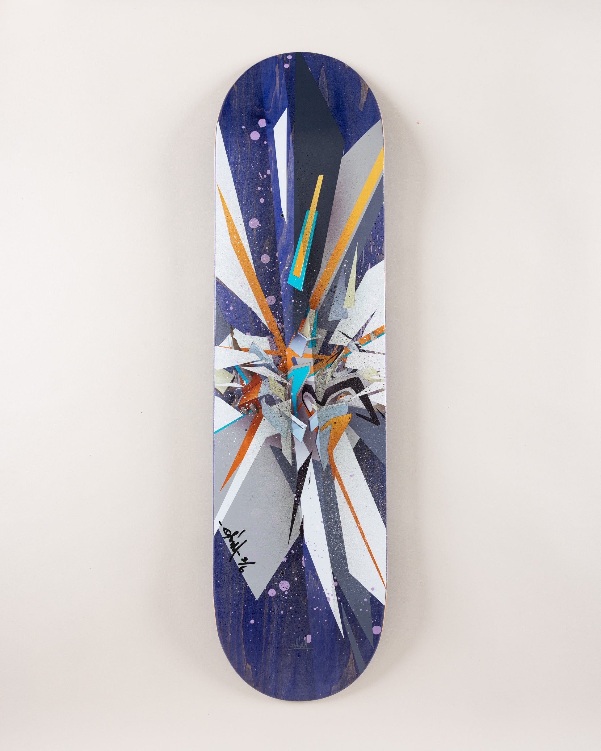 This deck is a collector’s piece for connoisseurs of contemporary urban art. It unites the monumental dimension of a unique mural with the intimacy of an object that can be held, observed, and owned.
